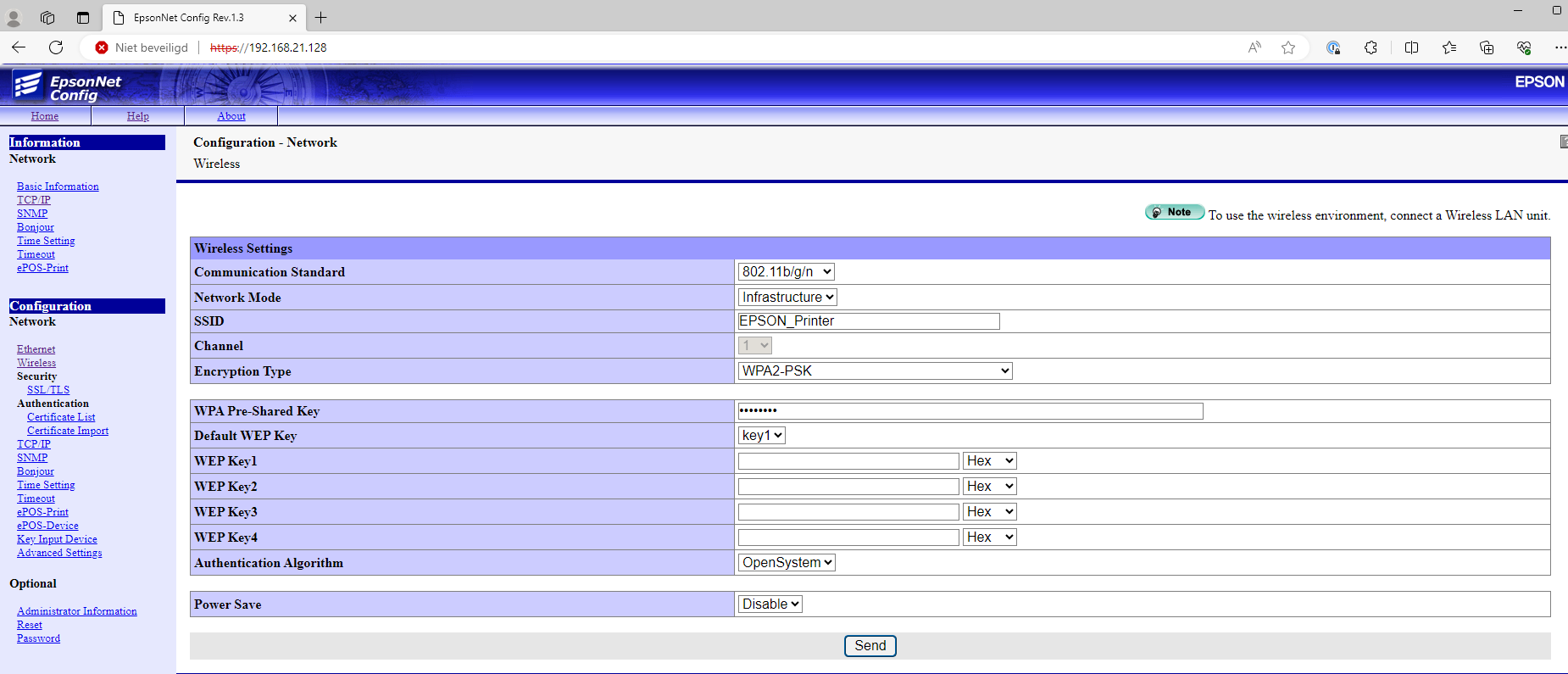 1. Als je bent ingelogd op de EPSON printer krijg je een configuratie scherm te zien.