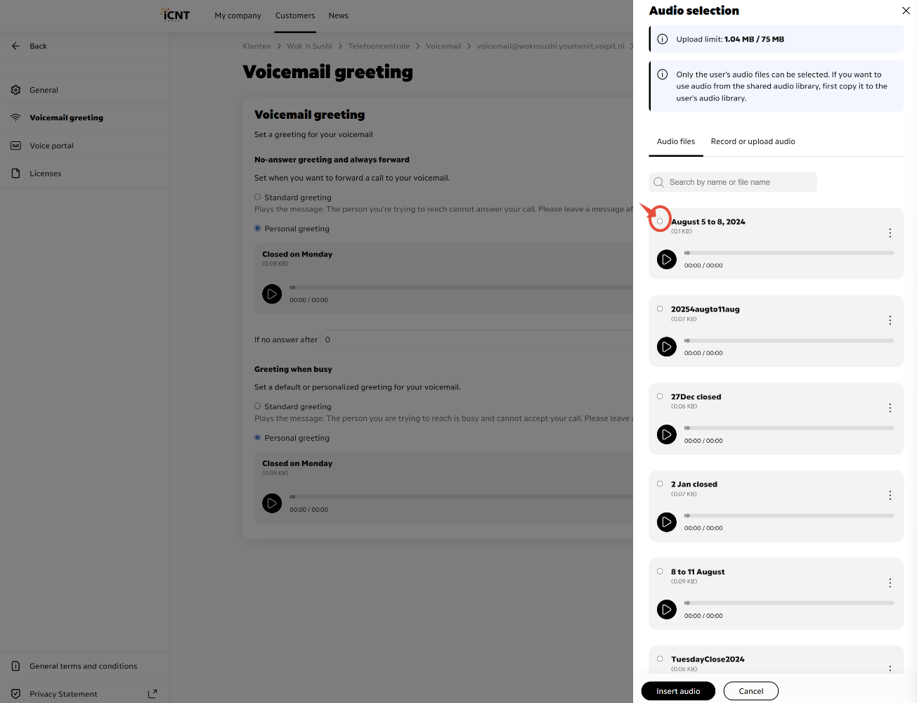 For example , customer is back from a vacation and he want to change his Voicemail back to the previous one ( original one that has been used before, so it should be already uploaded in the OneBase )